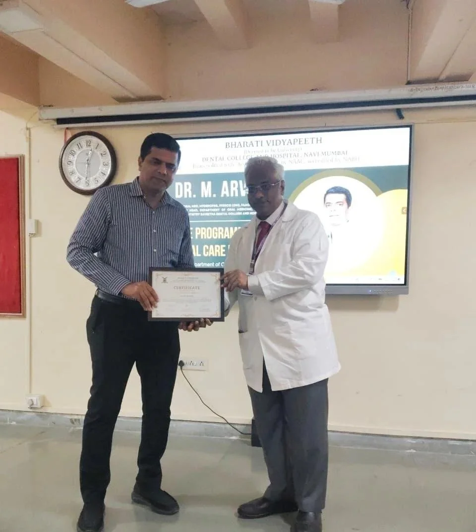 Dr.M.Arvind honoured for delivering a lecture at Bharati Vidyapeet Dental College & Hospital